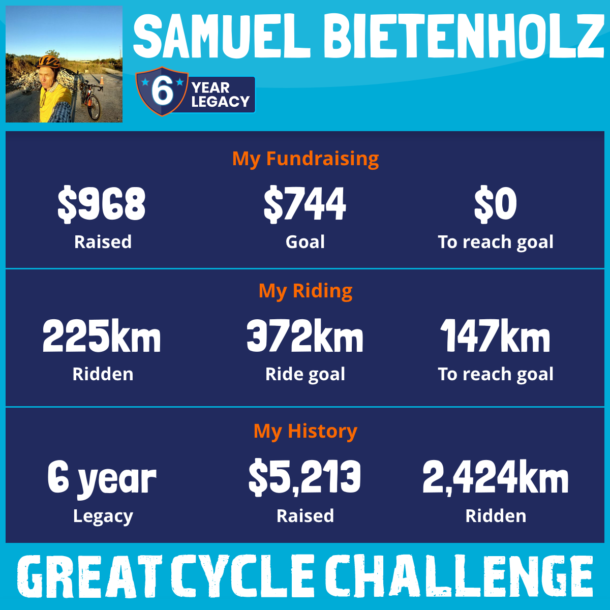 It is August and another year for the Great Cycle Challenge to Fight Kids' Cancer! Please help me raise $744 by donating to my 372km challenge for 2025.