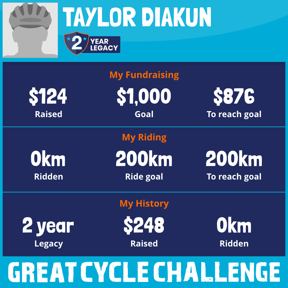 I am riding 200 km in memory of my aunty, Joanne Diakun. Please sponsor me and support my challenge to fight kids' cancer and save little lives.