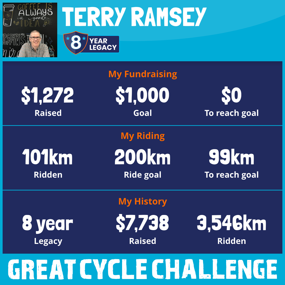 The challenge doesn't end though, so you can support even more by sharing my post/ride page so others see it. If we can pass $1500, that will be $8000 donated over the last 8 years!