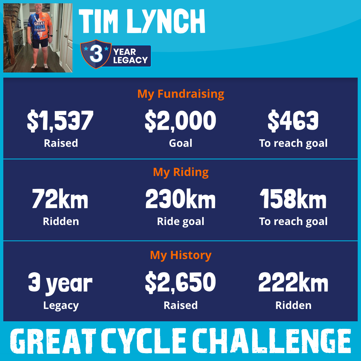 This year I am riding with Cancer as I was diagnosed in December 2024, I have committed to 230km but I plan to do more than that.