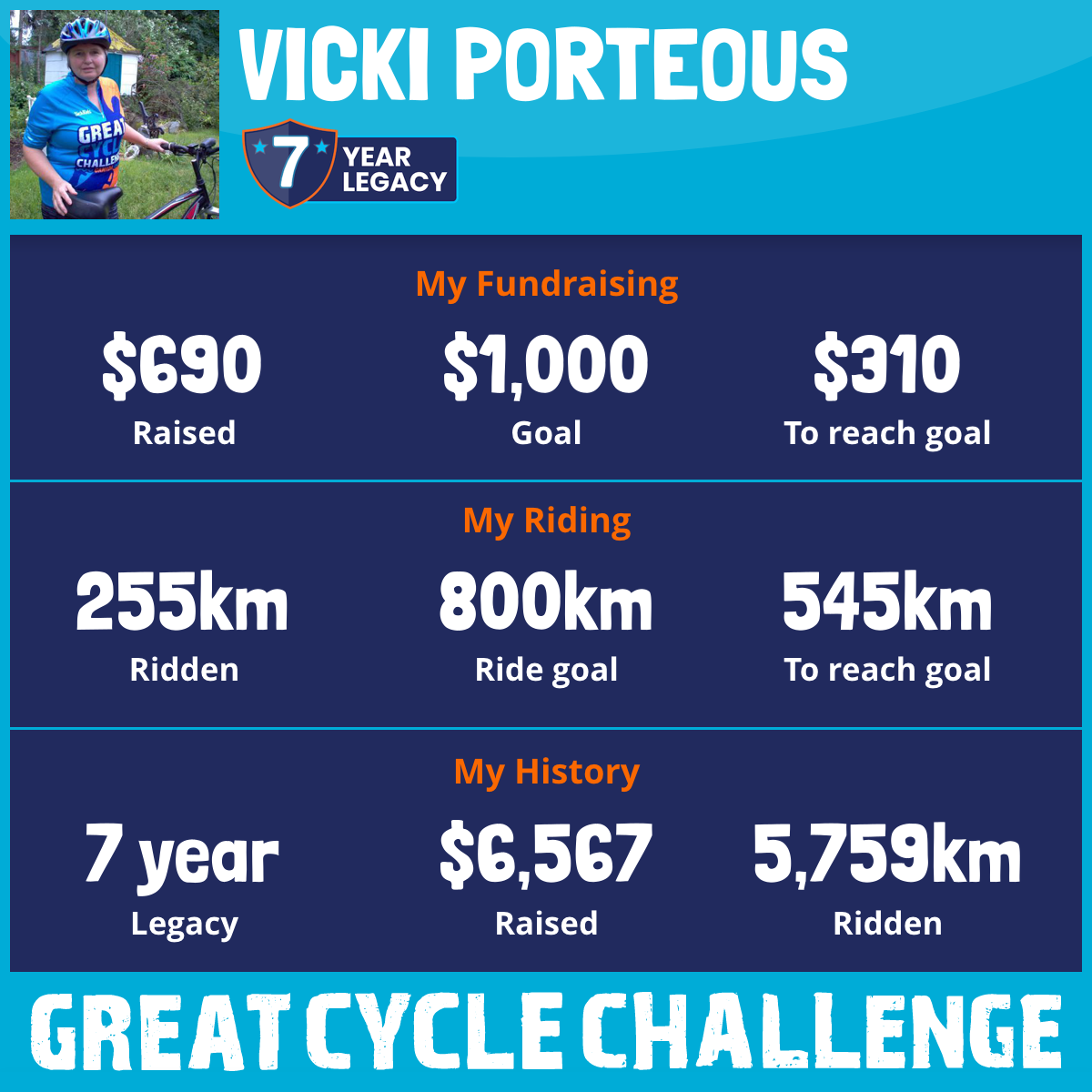 I rode in the June 2019 challenge and had so much fun I decide to ride again in 2020 .where I again more than achieved my goals. This will be my 7th year,. This year my goal is two ride 800 km ( a goal I hope to exceed ) and raise $2,500.00.