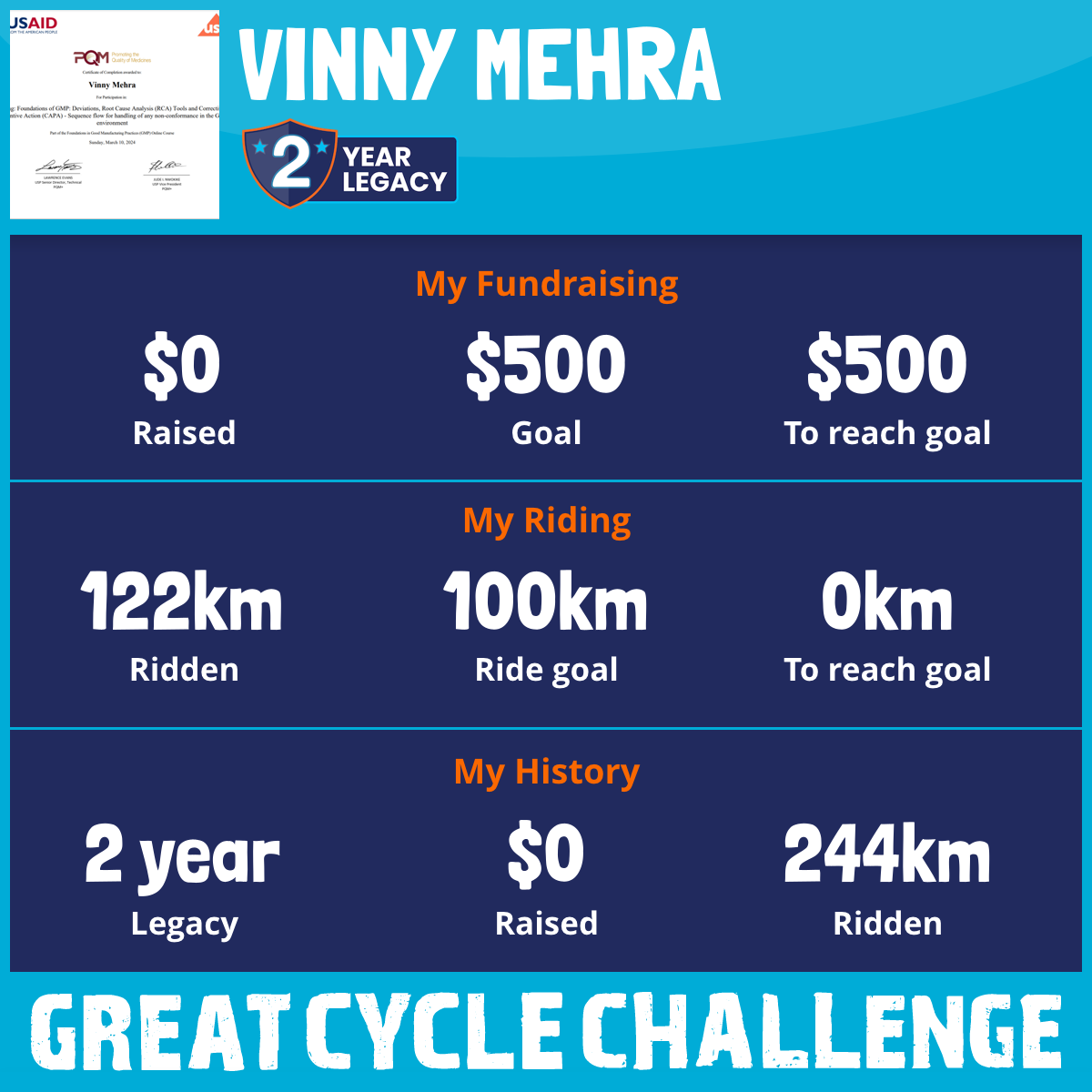 I am riding 100 km in memory of ON Mehra. Please sponsor me and support my challenge to fight kids' cancer and save little lives.