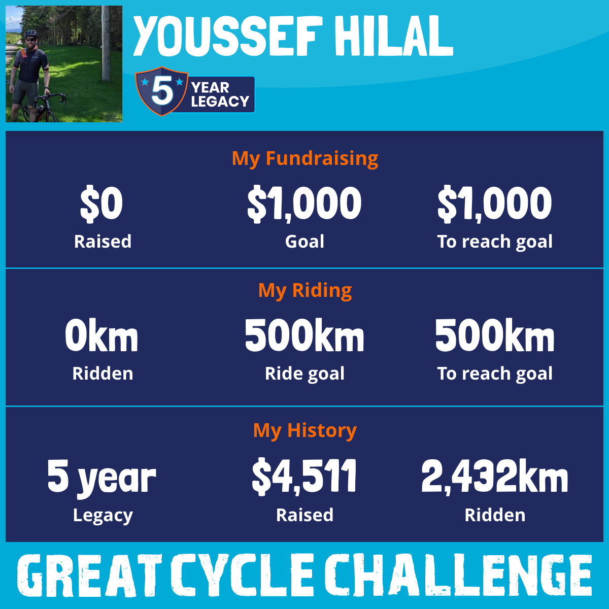 Hi Everyone, thank you very much for your support over the last 4 years!! This August, I am taking part in the Great Cycle Challenge once again to fight kids' cancer for the 5th year in a row!